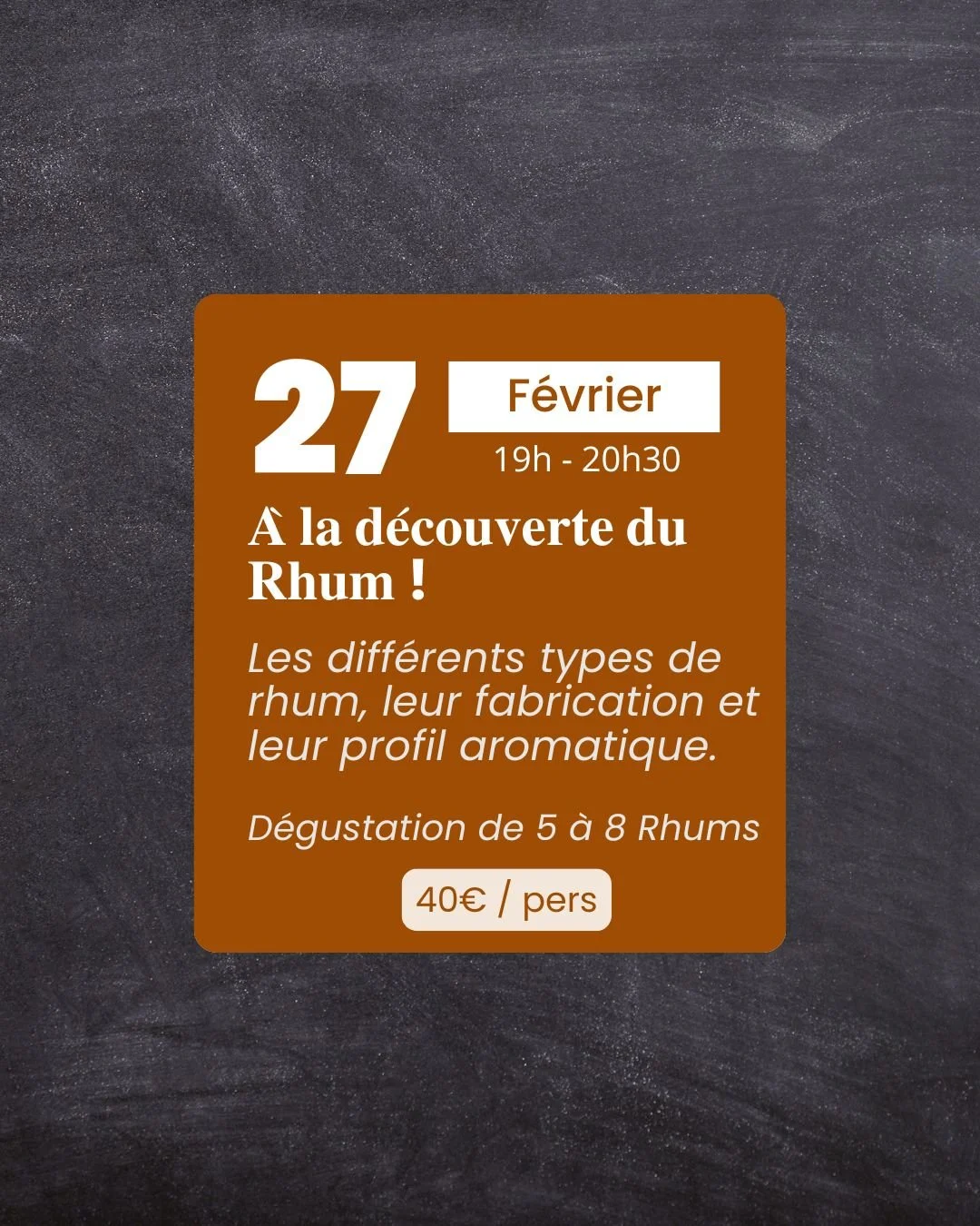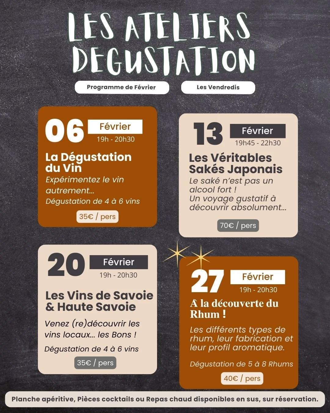 Petit grignotage inclus, planche apéritive disponible : 15€/personne